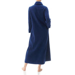 Long length gown with collar and button front opening. This warm and cosy gown has a shaped yoke, collar and cuffs with satin piping. Softly gathered skirt into the yoke. Elegant all over embroidery in self colours on the yoke.