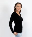 Superbly warm Merino wool long sleeve thermal top. Side seam free, trimmed with luxurious Guippure motif.